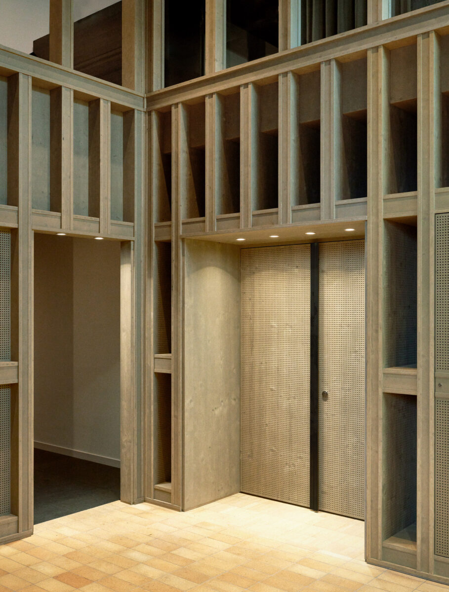Das zweigeschossige Foyer wird von einem hohen Rastermöbel ausgekleidet und gibt ihm Struktur, horizontal wie auch vertikal. Das Rastermass ist aus den unterschiedlichen Anforderungen, den Öffnungen und den zu integrierenden Funktionen entwickelt worden. Es ist ein Multi-Tasking Möbel, das neben Ein- und Ausgängen eine Glas-Installation, eine Garderobe und ein Helmregal beinhaltet und nach oben als Brüstung einer Galerie abschliesst. Die Konstruktion ist aus preiswerten, roh anmutenden Massenwerkstoffen erstellt, um die industrielle Stimmung der Kehrichtverbrennungskammer wiederzugeben. Der Boden ist mit feuerfesten Schamottsteinen ausgelegt. Die oberen zwei Raster-Reihen sind offen gehalten, um eine räumliche Beziehung zwischen Empfang, Foyer, Treppenaufgang und Galerie zu ermöglichen.