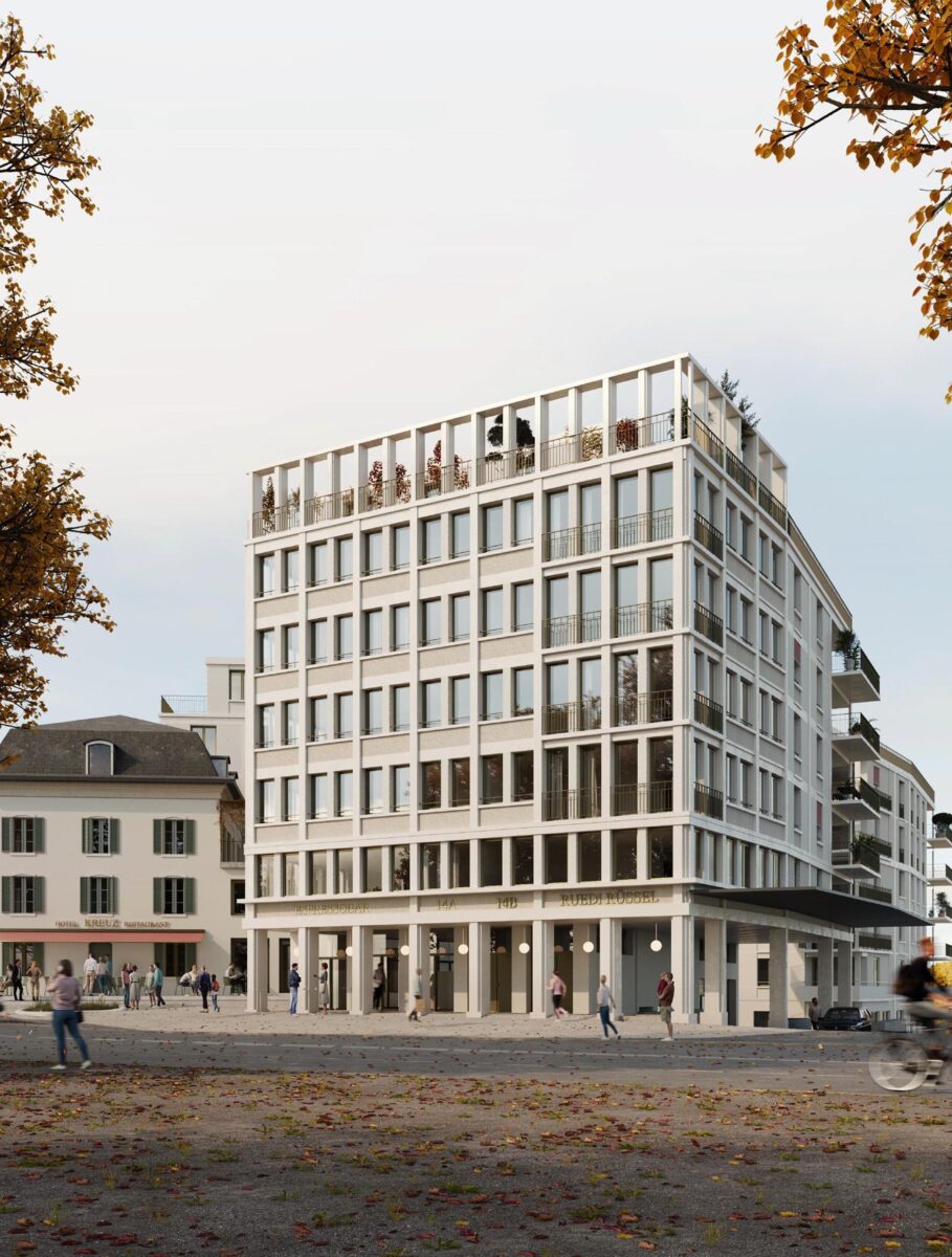 Die neue Überbauung fasst den Platz mit einem markanten Baukörper gegen Osten und belebt ihn mit einem gastronomischen Angebot im Erdgeschoss. Die Kolonnade bietet dem Lokal räumlichen Schutz und erschliesst gleichzeitig ein Wohn- und Geschäftshaus mit prominenter Adresse.